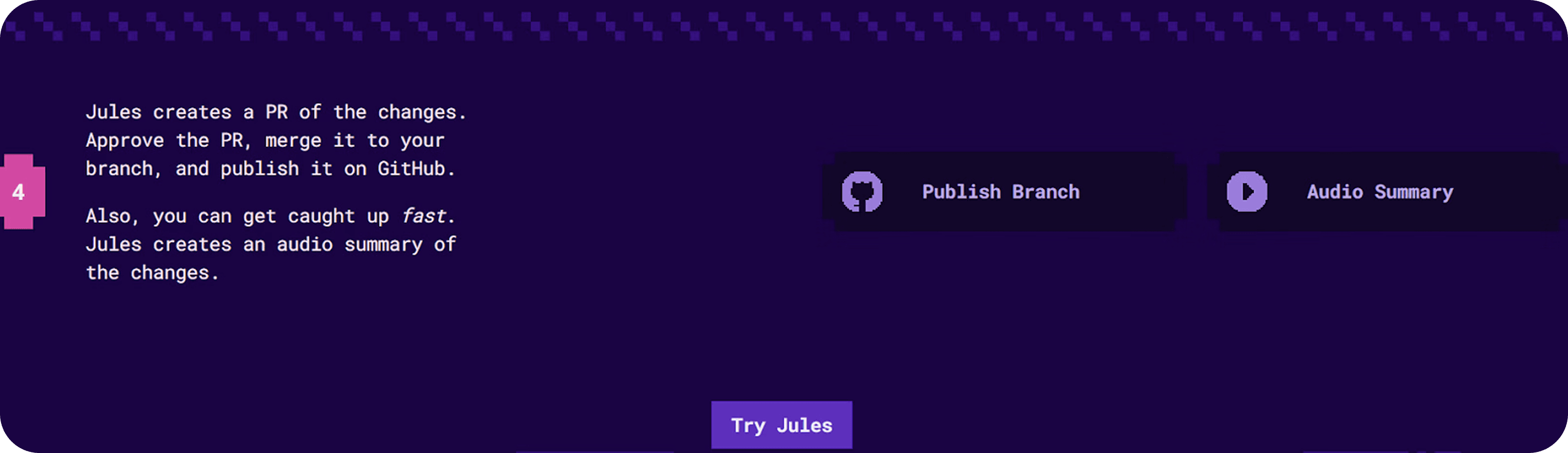 Audio Summaries: A unique feature is audio changelogs (Just like NotebookLM). Jules can produce spoken summaries of recent project commits or changes, turning version history into an audible narrative. This helps developers quickly catch up on what has changed.