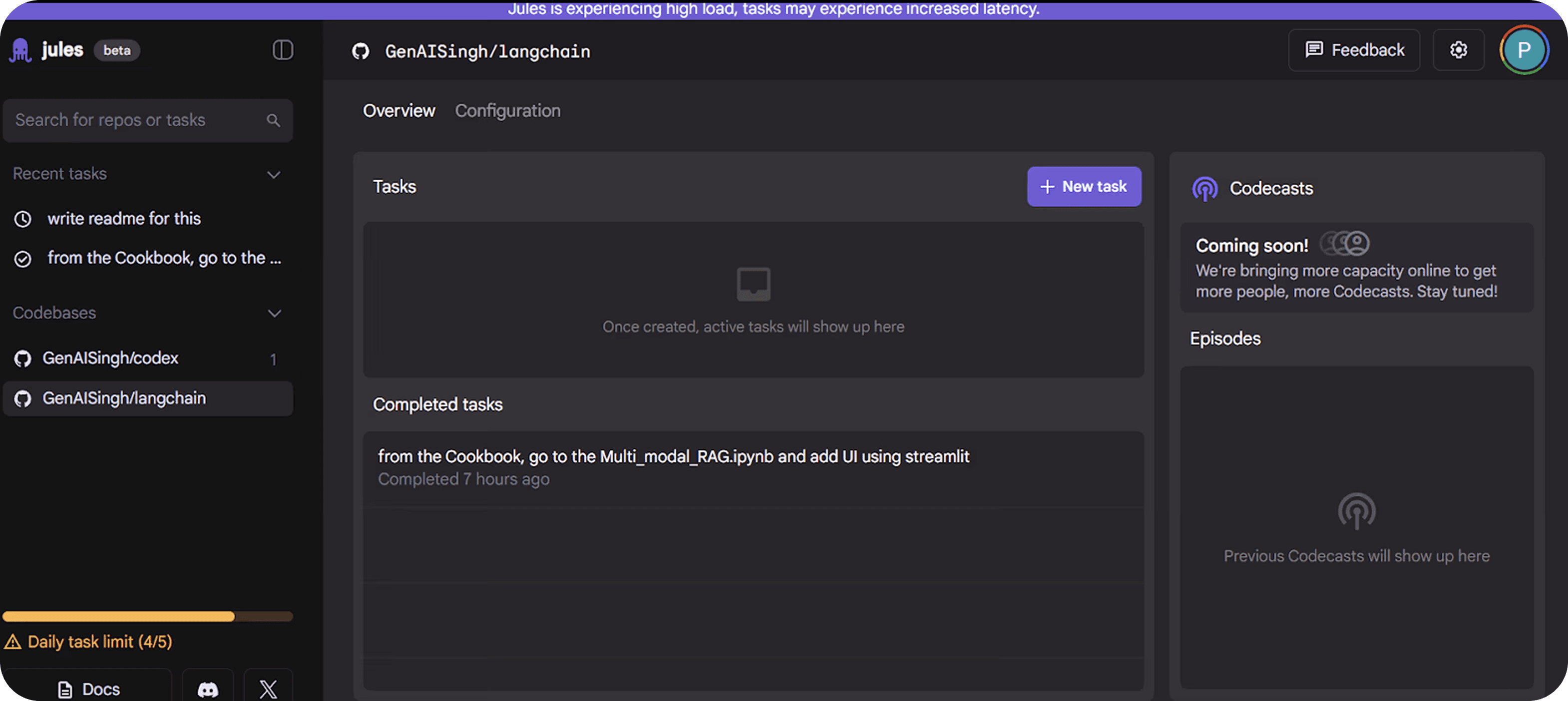 If you hit these ceilings, the "new task" button will take a little nap, and Jules will let you know why. You can still manage and review your existing tasks.